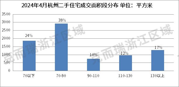 从成交面积段分布来看,4月杭州二手住宅成交主要集中在70-90㎡的房源,合计成交2930套,占比约38%;70㎡以下的房源成交量次之,共1865套,占比24%。值得注意的是,面积在90㎡以下的房源成交占比较3月再次提升2个百分点,达62%。