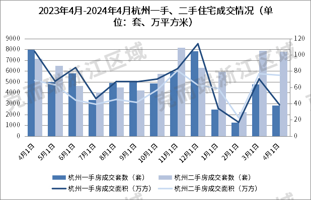 4月,杭州(除临安、富阳)二手住宅市场共计成交7805套房源,环比下跌1.3%;成交面积75万方,环比下跌2.4%。同期新房成交套数为2828套,环比下跌41.1%;成交面积约为38万方,环比下跌45.2%