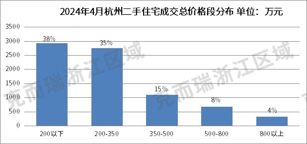 从成交总价段来看,4月杭州二手住宅成交主要集中于200万以下的总价段房源,共成交房源2936套,占比38%,套均价约143万元。成交总价段在800万以上的房源垫底,占比约4%。总价在200万及以下的房源成交较上月增加3个百分点,呈现上升趋势,这也印证了低总价的“老破小”在4月份的二手房市场中贡献较大。