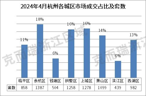 余杭区成交量为1387套,占比约18%,位列八区头部;其次是上城区,成交1278套,占比约16%。