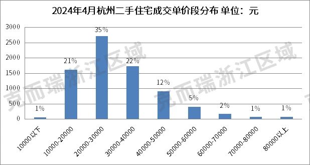 从成交单价段来看,4月杭州二手住宅成交主要集中在2-3万单价段房源,共成交2721套,占比35%;3-4万单价段房源次之,成交1729套,占比22%。从成交单价段来看,杭州二手房市场仍是刚需购房者为主。