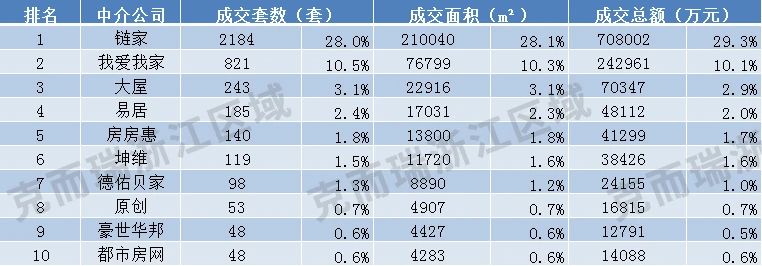 4月杭州TOP10中介排名中,杭州链家房地产经纪有限公司共成交2184套房源,占全市二手房成交总量的28%,登顶杭州二手房交易的中介榜。其次是我爱我家,成交821套房源,杭州易居房地产则以185套的成交量位列TOP4。