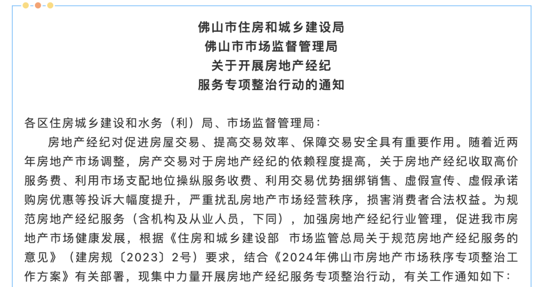 2024年7月12日,佛山市住建局和市监局联合发布通知,宣布将于2024年7月至10月期间,全面开展房地产经纪服务专项整治行动。
