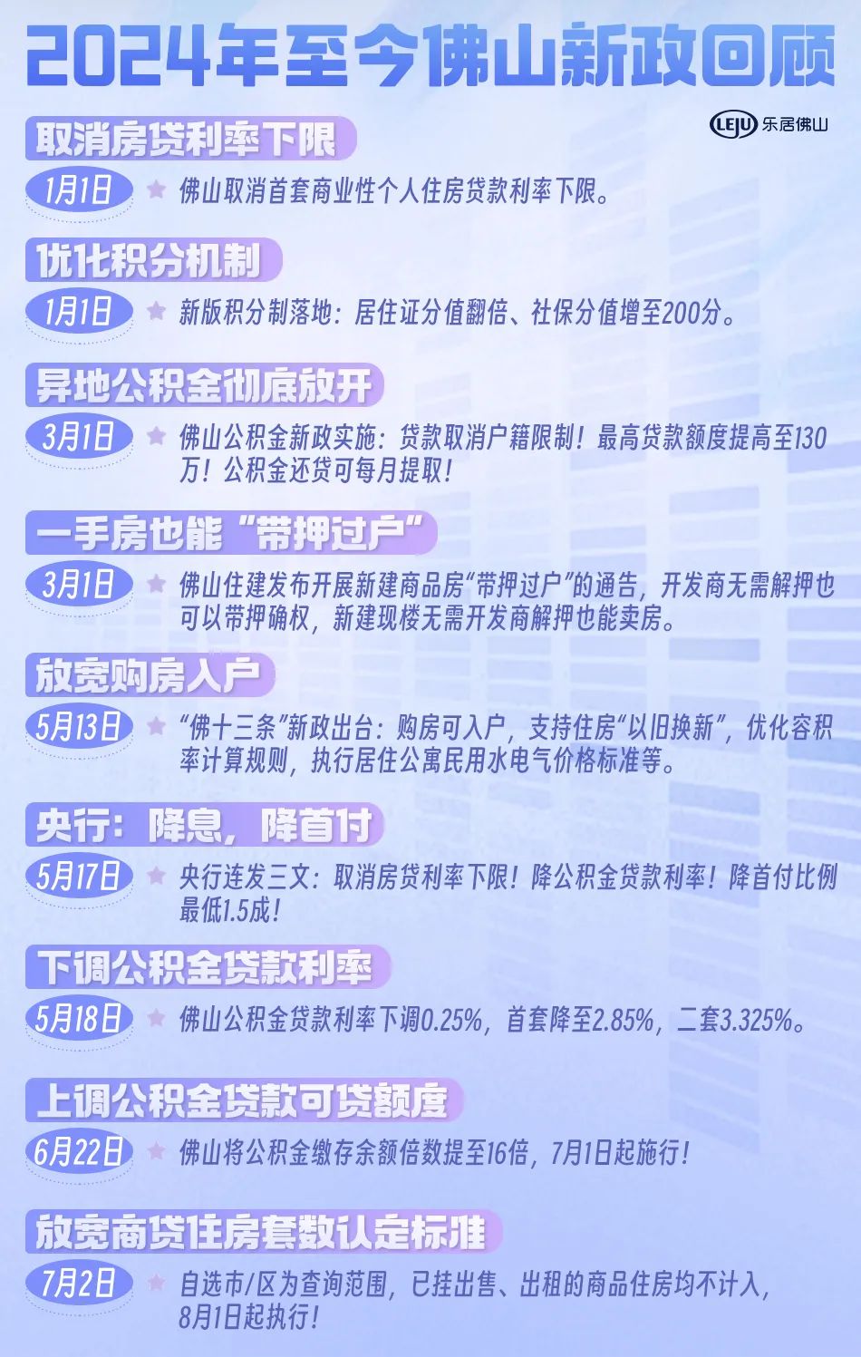 自年初以来,佛山不仅推出了13条新政,更持续不断调整和优化楼市政策,包括全市恢复购房入户、降低房贷利率、提高公积金贷款额度、取消公积金贷款户籍限制、降低首付、以旧换新免契税、带押过户、放宽商贷住房认定、可提取公积金支付首付等一系列举措。