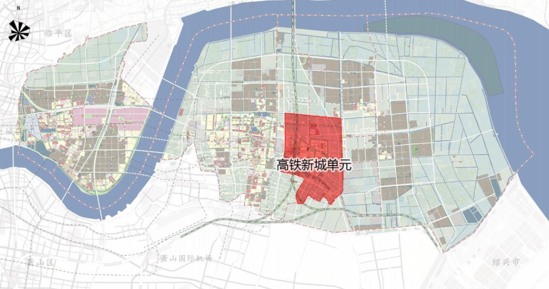 钱塘高铁新城单元东至八工段直河,南至钱塘快速路—新湾街道界,西至头蓬快速路—新湾街道界,北至江东一路,总用地面积为28.36平方千米,规划人口14.90万。