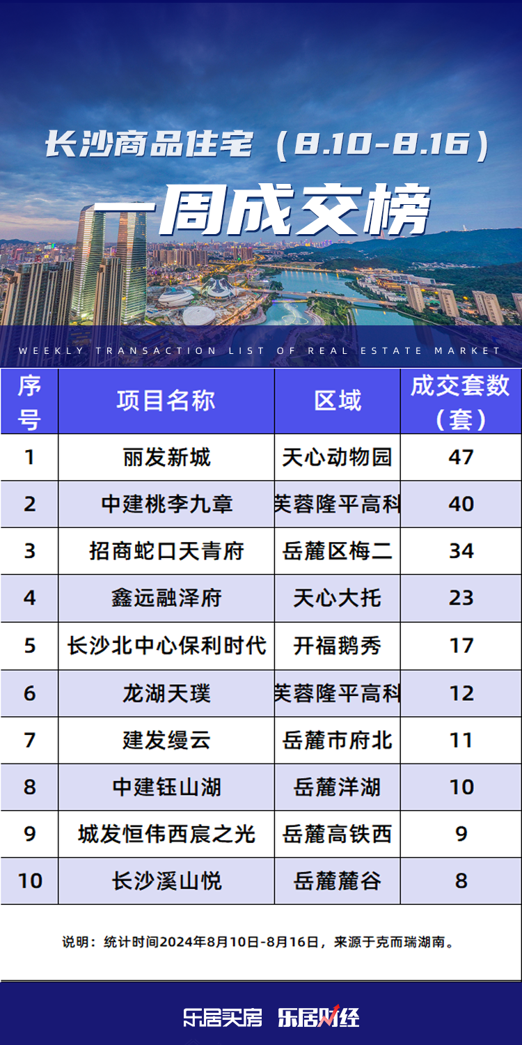 其中位于榜单前三位的分别为天心区动物园板块的丽发新城、芙蓉区隆平高科板块的中建桃李九章,岳麓区梅溪湖二的招商蛇口天青府、分别成交47套、40套、34套。