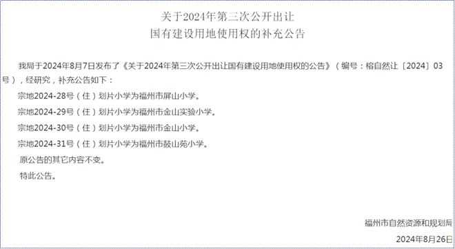 8月26日,福州市资规局发布《2024年第三次公开出让国有建设用地使用权的补充公告》,明确四幅地块小学划片,虽然不是以政策形式,但是这在福州土拍中,尚属首次。