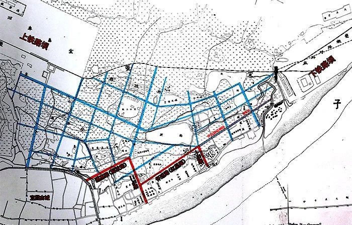 (图源巴楚旧影——金鼎编制的宜昌商埠区规划方案,蓝色为预先设计的整体道路规划,红色为先行修筑的四条示范马路,分别是一马路、二马路、怀远路、通惠路)