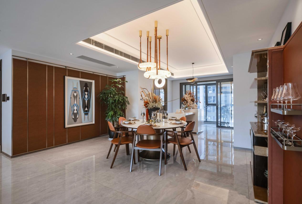南北双面采光的一体化餐客厅连接阳台,为空间增添通透感的同时,给公区留出了阔绰天地,可以hold得住任何一场家庭派对。南向外接约10.2米景观阳台直面小区中央大花园,搭配约4㎡的落地巨幕玻璃,带来无比震撼的全景式开阔视野。
