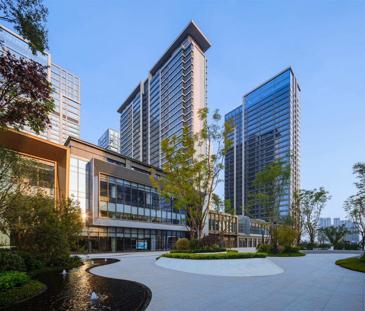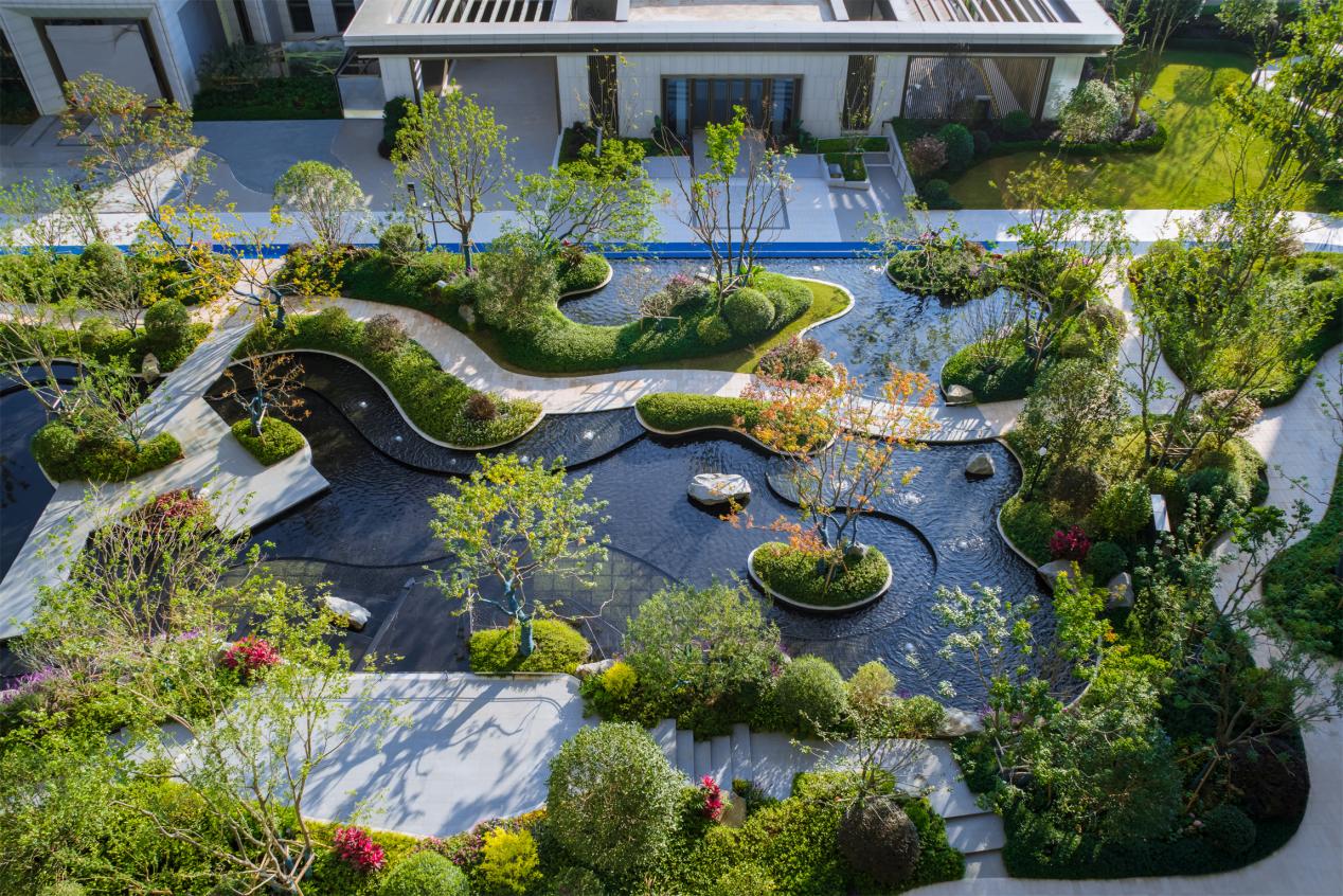 在这片精致的园林中,种植了乌桕、蓝花楹等丰富树种,还有天然石材的巧妙运用,在叠山理水的造园手法下,勾勒出了一幅充满东方韵味的画卷。