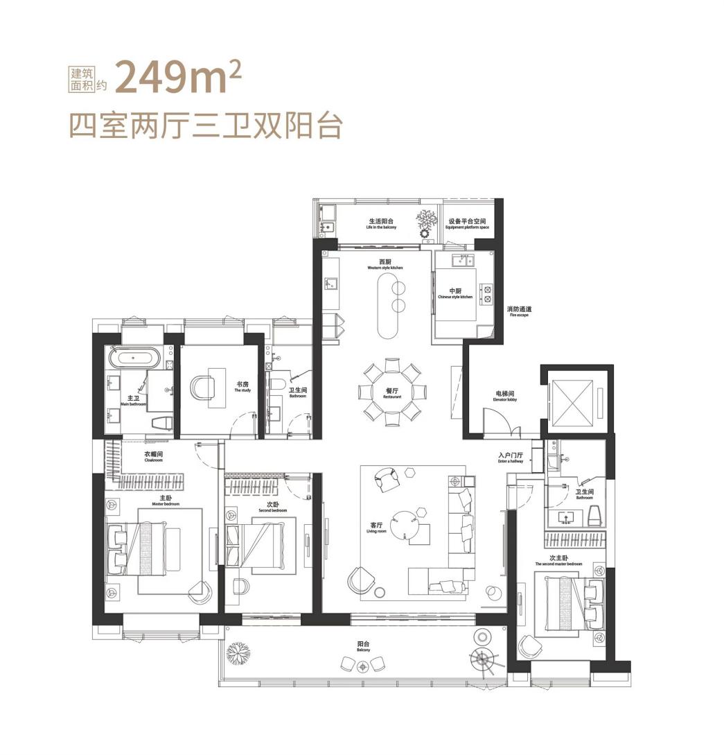 以建面约 249㎡的大平层户型为例,四房两厅三卫格局,独立电梯入户,附带约 10㎡的私家电梯厅可做独立玄关。四开间朝南,实现 “阳光平权”。南北双面采光的一体化餐客厅连接阳台,外接约 10.2 米景观阳台直面小区中央大花园,搭配约 4㎡的落地巨幕玻璃,视野开阔。厨房采用中、西式双设计,双主卧套房以星级酒店套房体系打造,配置步入式衣帽间与超大尺度卫浴。此外,通过飘窗、电梯厅等高拓展空间的加持,该户型得房率非常出色。