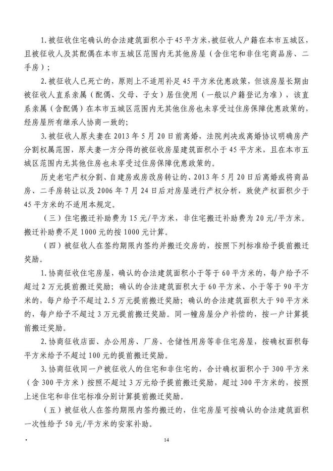 1.协商征收住宅房屋,确认的合法建筑面积小于等于60平方米的,每户给予不超过2万元提前搬迁奖励;确认的合法建筑面积大于60平方米、小于等于90平方米的,每户给予不超过2.5万元提前搬迁奖励;确认的合法建筑面积大于90平方米的,每户给予不超过3万元提前搬迁奖励。同一幢房屋分户补偿的,按一户计算提前搬迁奖励。