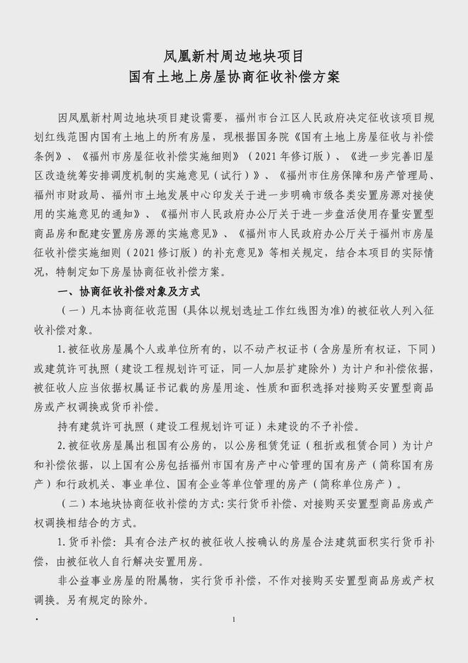 因凤凰新村周边地块项目建设需要,福州市台江区人民政府决定征收该项目规划红线范围内国有土地上的所有房屋,现根据国务院《国有土地上房屋征收与补偿条例》、《福州市房屋征收补偿实施细则》(2021年修订版)、《进一步完善旧屋区改造统筹安排调度机制的实施意见(试行)》、《福州市住房保障和房产管理局、福州市财政局、福州市土地发展中心印发关于进一步明确市级各类安置房源对接使用的实施意见的通知》、《福州市人民政府办公厅关于进一步盘活使用存量安置型商品房和配建安置房房源的实施意见》、《福州市人民政府办公厅关于福州市房屋征收补偿实施细则(2021修订版)的补充意见》等相关规定,结合本项目的实际情况,特制定如下房屋协商征收补偿方案。