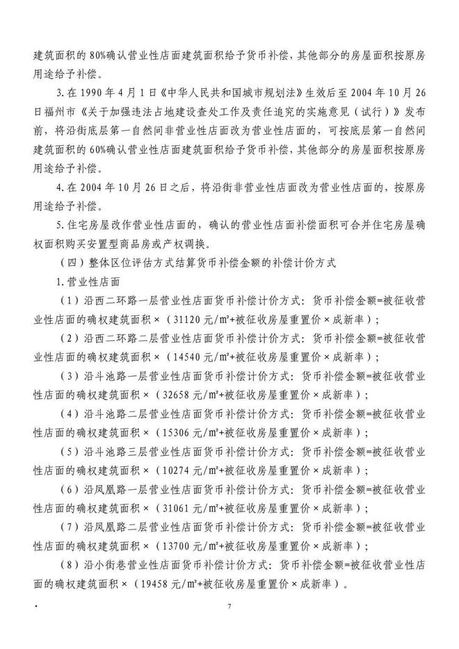 (6)沿凤凰路一层营业性店面货币补偿计价方式:货币补偿金额=被征收营业 性店面的确权建筑面积x (31061元/㎡+被征收房屋重置价x 成新率);