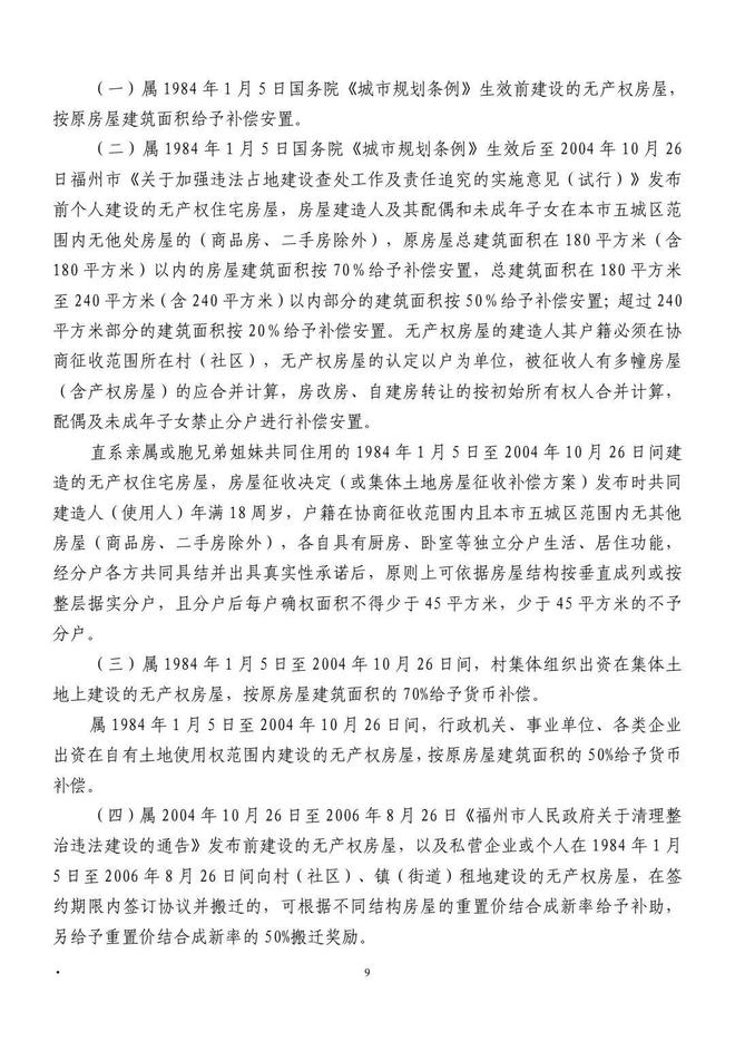 (二)属1984年1月5日国务院《城市规划条例》生效后至2004年10月26日福州市《关于加强违法占地建设查处工作及责任追究的实施意见(试行)》发布前个人建设的无产权住宅房屋,房屋建造人及其配偶和未成年子女在本市五城区范围内无他处房屋的(商品房、二手房除外),原房屋总建筑面积在180平方米(含180平方米)以内的房屋建筑面积按70%给予补偿安置,总建筑面积在180平方米至240平方米(含240平方米)以内部分的建筑面积按50%给予补偿安置;超过240平方米部分的建筑面积按20%给予补偿安置。无产权房屋的建造人其户籍必须在协 商征收范围所在村(社区),无产权房屋的认定以户为单位,被征收人有多幢房屋(含产权房屋)的应合并计算,房改房、自建房转让的按初始所有权人合并计算,配偶及未成年子女禁止分户进行补偿安置。