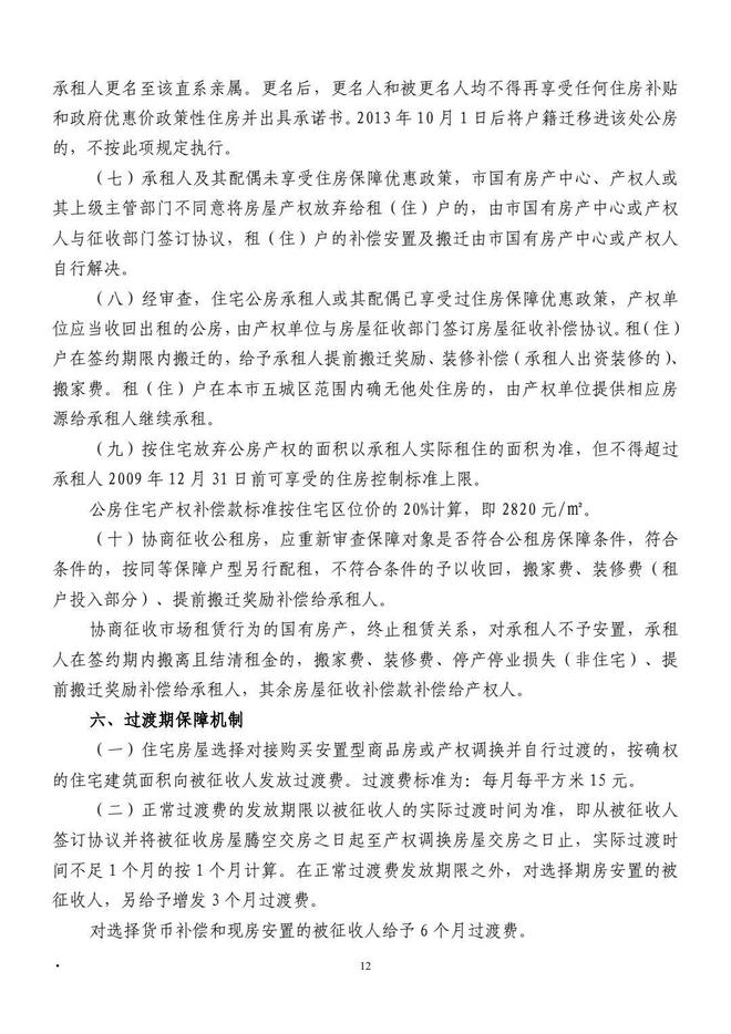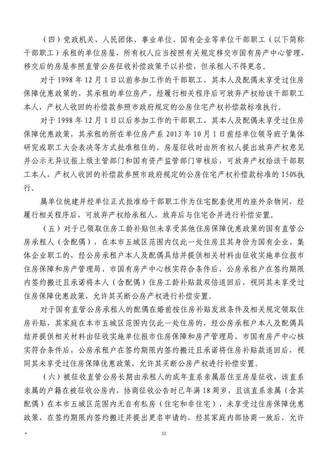 (三)国有直管公房(实行标准租金,下同)承租人及其配偶未享受住房保障优惠政策,承租人户籍在本市五城区(含正在参军、异地就学期间户籍迁出的),市国有房产中心同意将房屋产权放弃给承租人,且租(住)户在签约期限内搬迁的,市国有房产中心在收回市政府规定的住宅产权补偿款后,由租(住)户自行选择补偿安置方式并与征收部门签订协议搬迁。