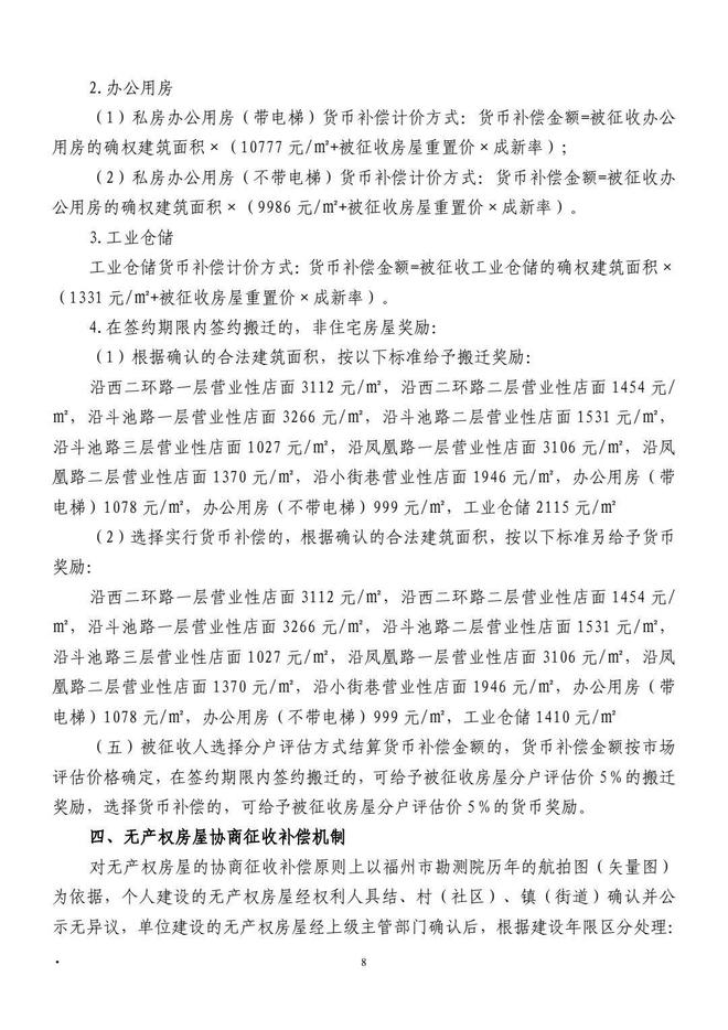 (4)沿斗池路二层营业性店面货币补偿计价方式:货币补偿金额=被征收营业 性店面的确权建筑面积x (15306元/㎡+被征收房屋重置价x 成新率);