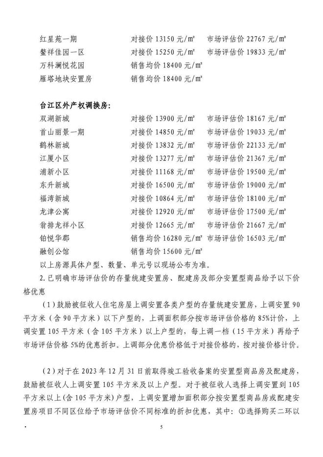(2)对于在2023年12月31日前取得竣工验收备案的安置型商品房及配建房,鼓励被征收人上调安置105平方米及以上户型。对于被征收人选择上调安置到105平方米以上(含105平方米)户型,上调安置增加面积部分按安置型商品房或配建安置房项目不同区位给予市场评估价不同标准的折扣优惠,其中:①选择购买二环以内的安置型商品房或配建安置房项目,上调增加的面积部分按市场评估价计价;②选择购买二环与三环之间的安置型商品房或配建安置房项目,上调增加的面积部分按市场评估价95%计价;③选择购买三环外的安置型商品房或配建安置房项目,上调增加的面积部分按市场评估价90%计价;④上调增加的面积部分优惠价格低于对接价格的,按对接价格计价。
