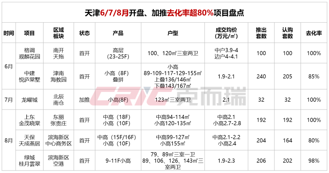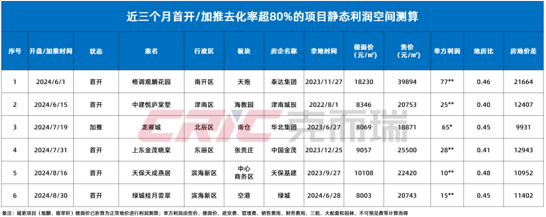 克而瑞天津机构整理了一下近三个月天津首开或加推去化率超过80%的项目,发现它们多是新一代产品、利润空间相对不错(此处指静态利润空间)。