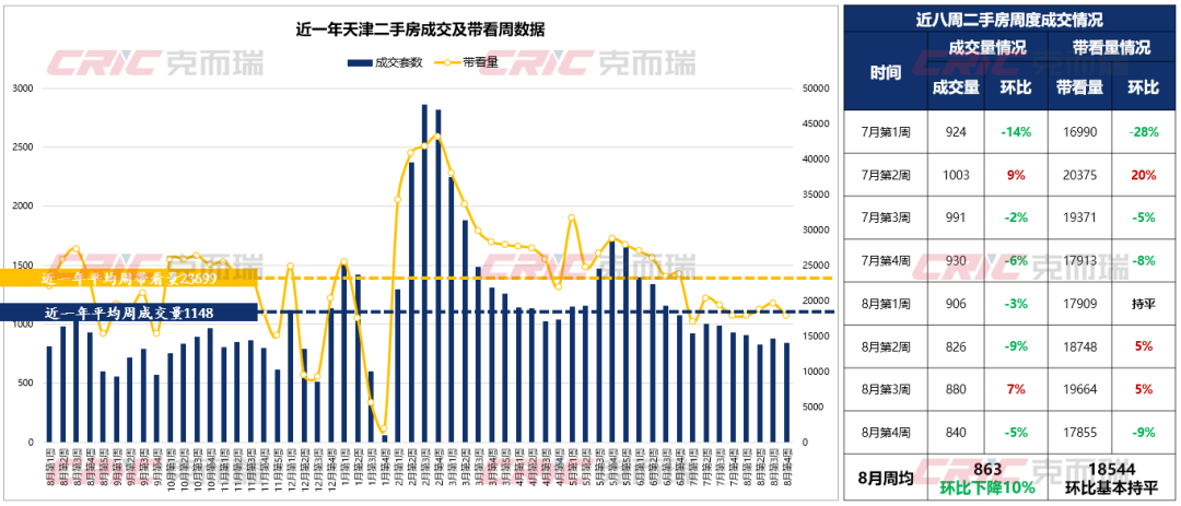 8月二手房成交约3452套,环比下降10%,同比下降2%,带看量74176组,环比基本持平,同比下降18%;周均成交套数和带看量均低于近一年水平。