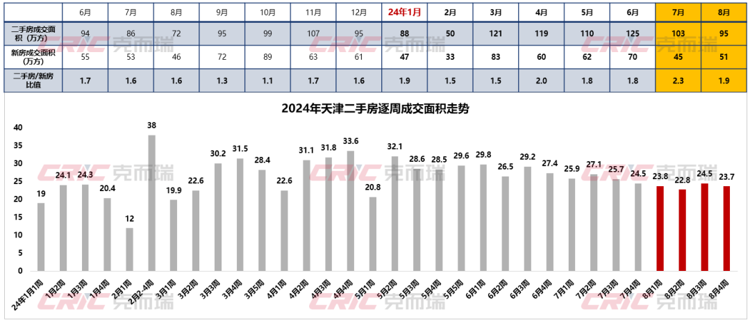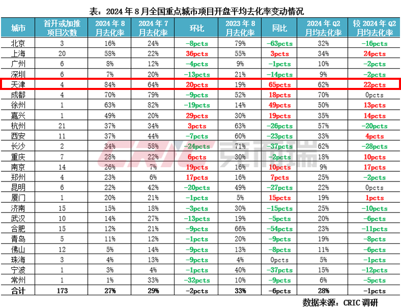 8月天津重点项目首开或加推的次数虽然只有4次,但去化率却高达84%,是24个重点城市中最高的。