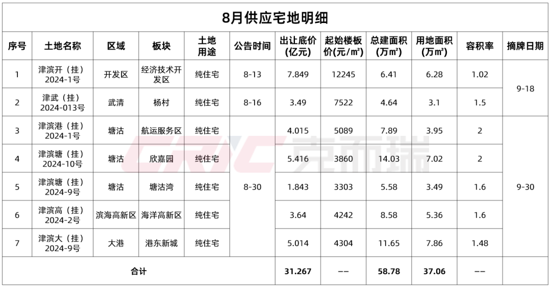 供应端8月,供应7宗宅地,其中6宗出自滨海新区,1宗为武清杨村的地块。7宗地块将分别在9月18日和9月30日摘牌。