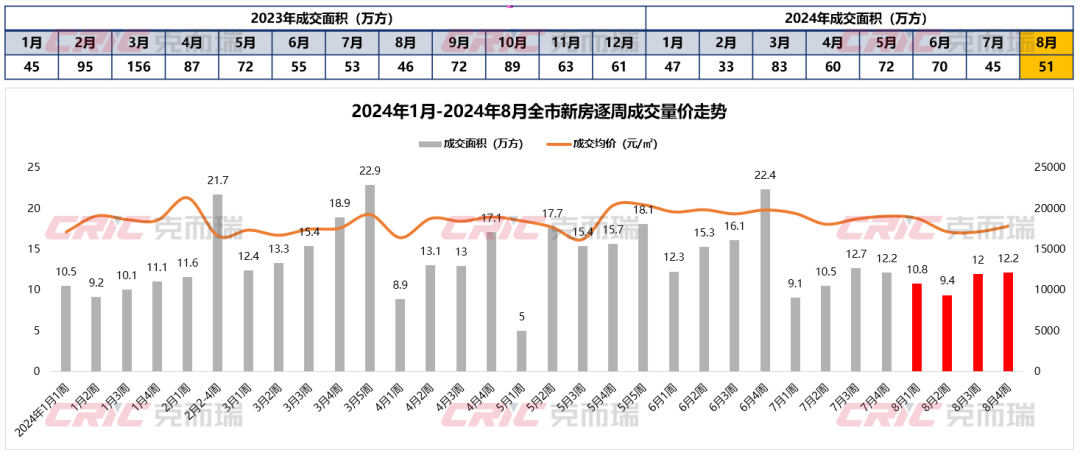 成交端,8月商品住宅成交约51万方,环比上涨约13%,同比上涨约11%;成交均价17831元/㎡,环比上涨约4%。