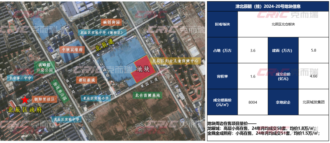 地块位于北辰核心所在,临近北辰区政府,周边配套完善,建面5.8万,容积率1.6。周边在售新盘月度成交50套+,流速有保证,区域市场处于新老接替的更新换代阶段,新产品规划项目具体较高市场认可度。