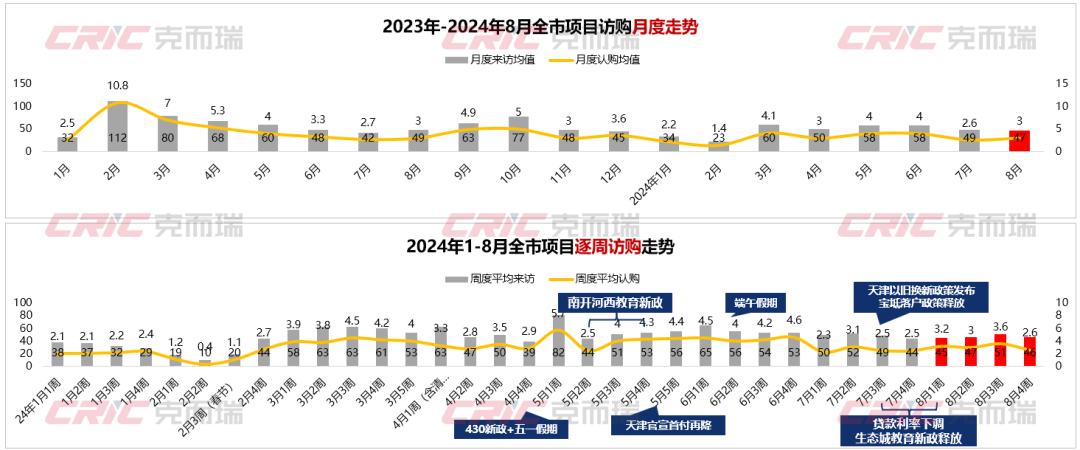 案场来访端,8月全市项目单盘周均到访47组,同环比均下降4%;单盘周均认购约3套,环比上涨15%,同比持平。访购四周无明显涨幅波动,保持低位稳定水平。