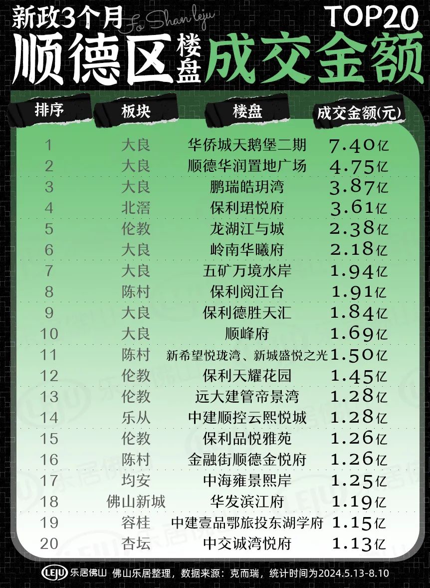 而以新政三个月数据来看,在顺德区住宅成交金额TOP20中,大良依然独霸7席,包括华侨城天鹅堡二期、顺德华润置地广场、鹏瑞皓玥湾、岭南华曦府、五矿万境水岸、保利德胜天汇、顺峰府均位居前列。