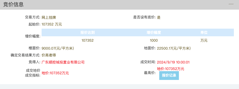 9月19日,广东顺控城投置业有限公司以107352万元竞得大良德胜西路以南地块,折合楼面价约9000元/㎡。