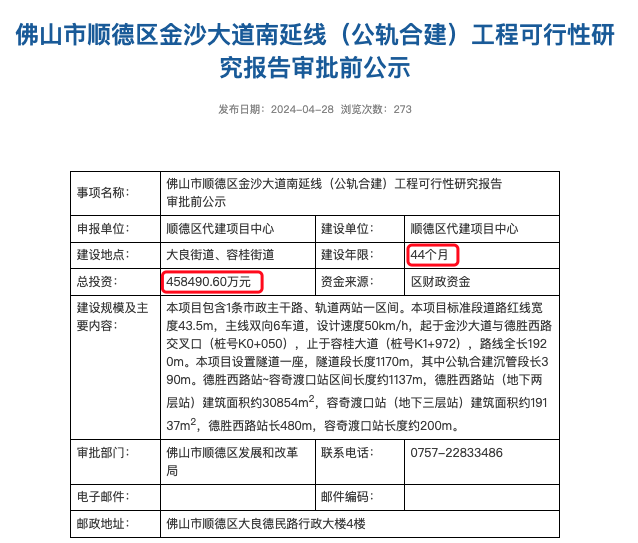 根据公示,该项目总投资45.85亿元,建设年限44个月,主要包含1条市政主干路、轨道两站一区间,即从德胜西路站到容奇渡口站。