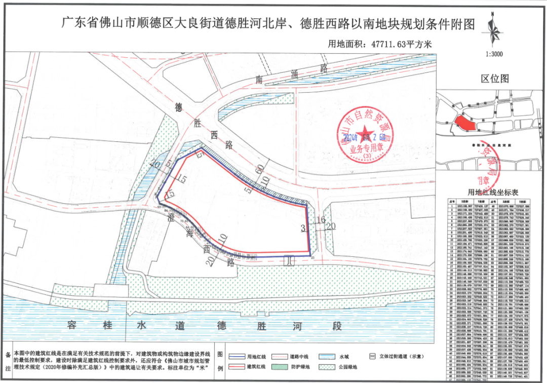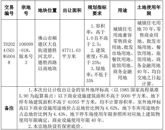 根据出让文件显示,宗地位于顺德区大良街道德胜河北岸、德胜西路以南,总占地面积47711.63㎡,为二类居住用地兼容商业商务用地,容积率不高于2.5,建筑密度不高于25%,绿地率大于35%,建筑控高120米。