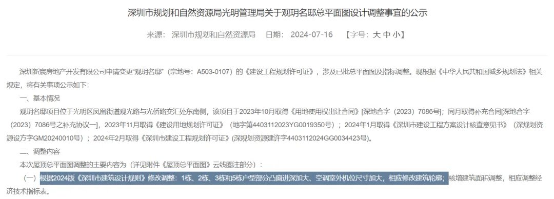 5月建筑设计新规后,深圳多个项目陆续调整规划设计。其中,大多集中调整凸窗面积,比如光明凤凰城板块的中建观玥名邸。