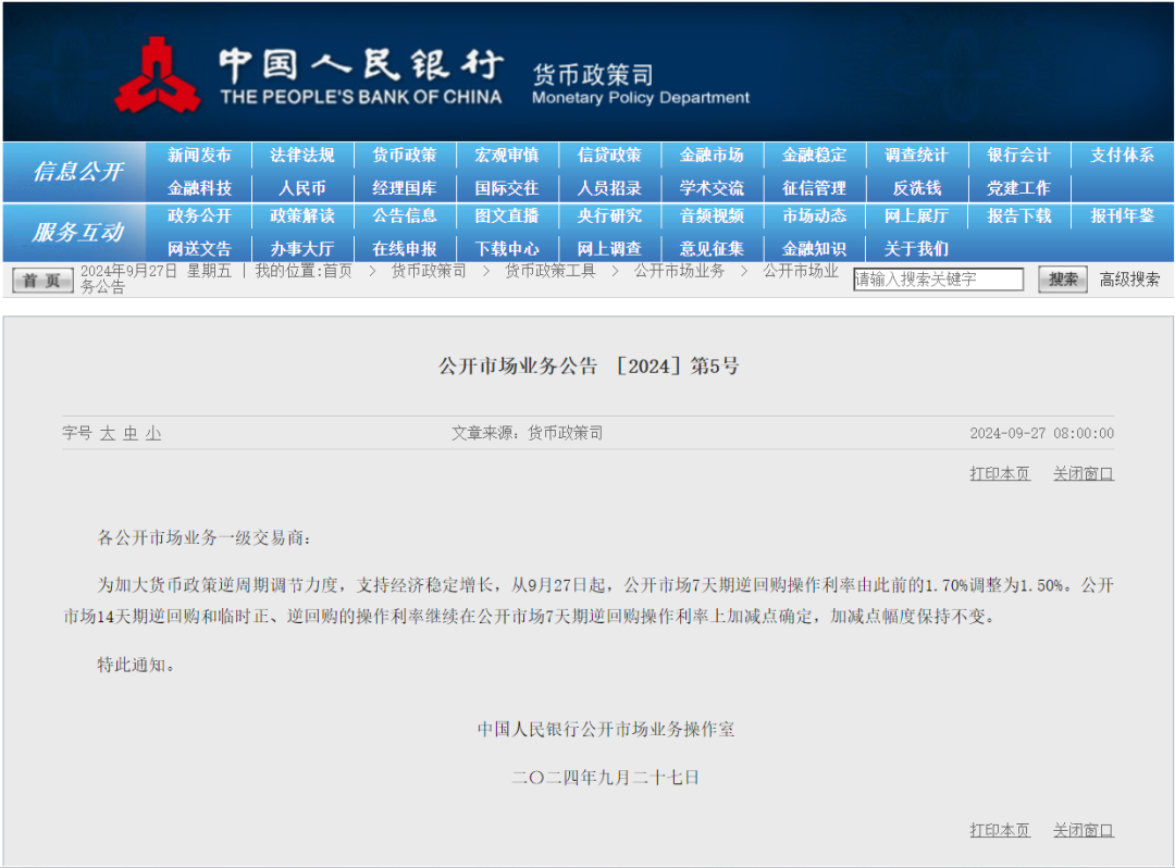 同日,中国人民银行公告,为加大货币政策逆周期调节力度,支持经济稳定增长,从9月27日起,公开市场7天期逆回购操作利率由此前的1.70%调整为1.50%。公开市场14天期逆回购和临时正、逆回购的操作利率继续在公开市场7天期逆回购操作利率上加减点确定,加减点幅度保持不变。