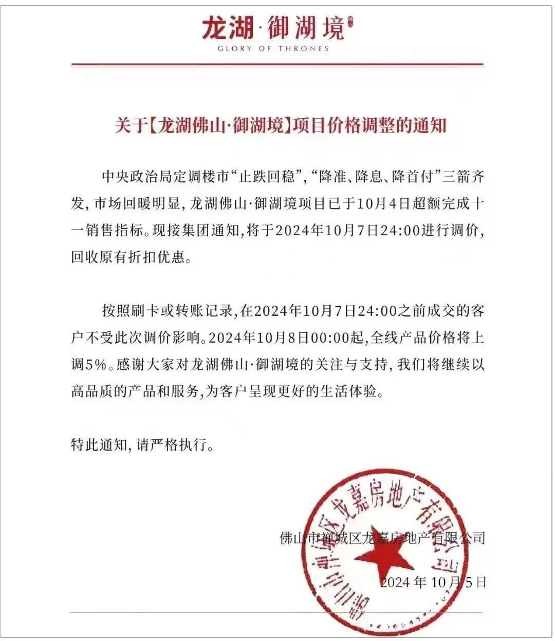 龙湖御湖境还发布了“红头文件”,表示项目已于10月4日超额完成十一销售指标,将于10月8日起收回原有折扣优惠,全线价格上调5%。