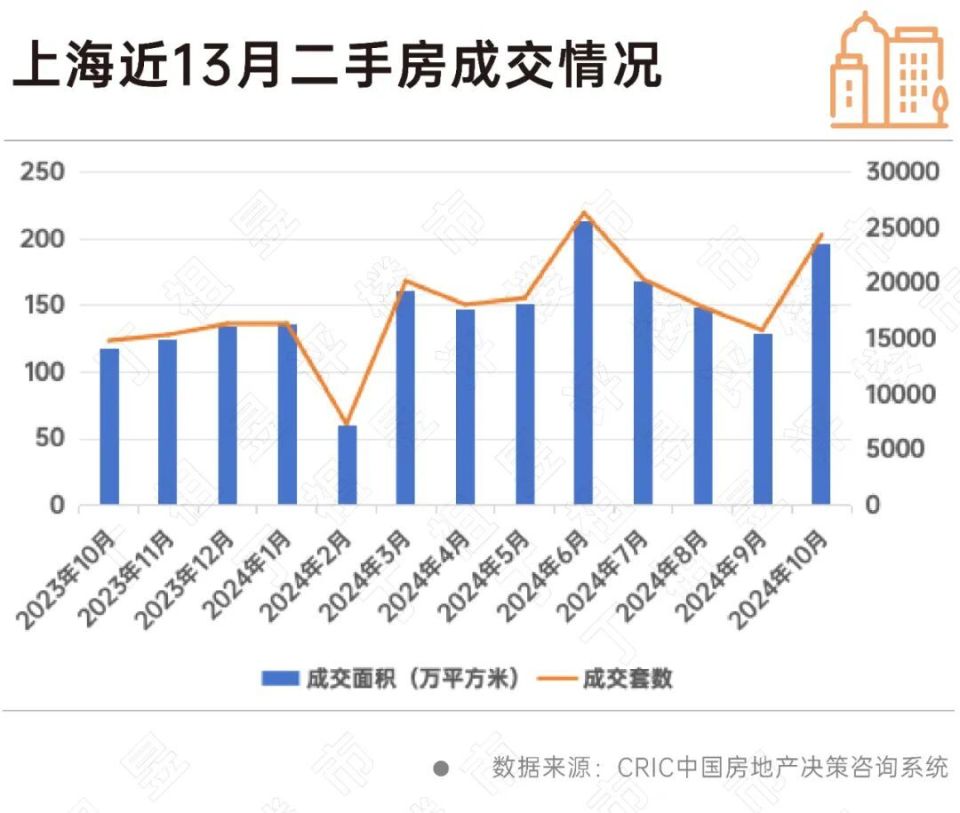 CRIC数据显示,2024年10月上海二手房成交面积约196.12万平方米,同比上涨66%,环比上升52%。