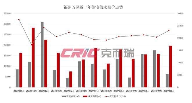从福州五区来看,虽然10月初楼市业绩喜人,住宅整体认购套数环比前一周涨幅超400%.但这一场脉冲式的复苏大戏,从中下旬开始暂停,成交量也逐渐回落,10月楼市整体呈现“前高后低”的态势。加上部分房源延迟备案,最终体现在网签数据上,10月成交量涨幅并不明显。据CRIC数据统计,10月份住宅成交量同比上涨约20.7%,环比则上涨约24.6%。
