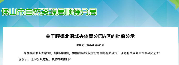 日前,顺德区政府网站发布了《关于顺德北滘城央体育公园的批前公示》,披露了公园的详细规划。