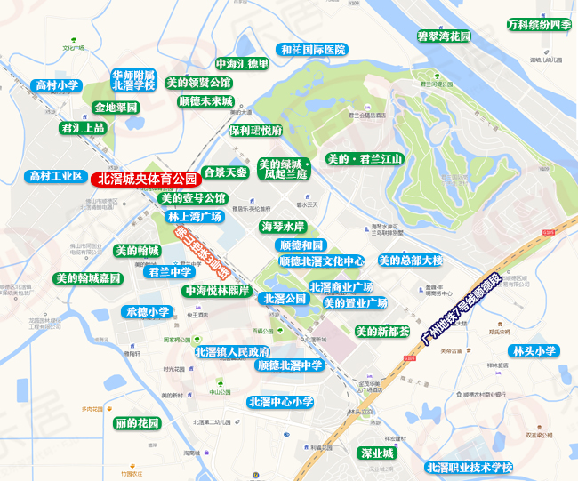 北滘城央体育公园就位于北滘新城板块,紧邻佛山地铁3号线高村站点,周边开发项目包括有绿城顺德杨柳郡、美的云悦江山、合景天銮、金地翠园、中海悦林熙岸等。