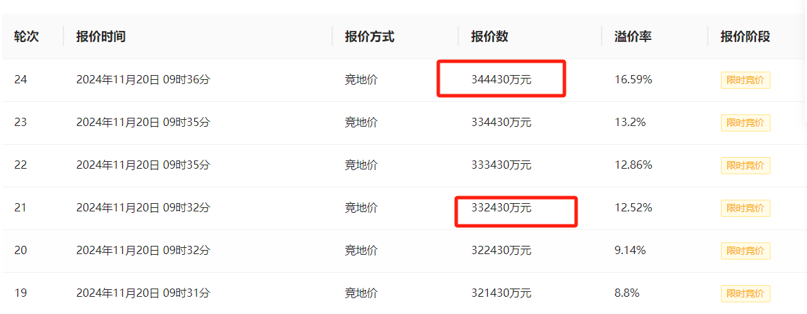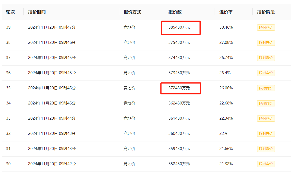 地块正式竞拍不到半小时,溢价率就已经超过30%,期间更是有房企多次加价1个亿。彼时楼面价达46967元/㎡,已经超过了凤起潮鸣,仅次于绿城今年10月拿的钱二“地王”项目(楼面价50717元/㎡)。
