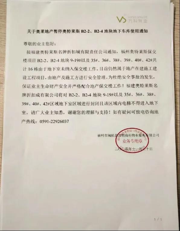 11月20日,福州市闽侯县万物商科物业发布一则通知,内容显示,接福建奥特莱斯名牌折扣城有限责任公司通知,福州奥特莱斯保交楼项目B2-2、B2-4地块9-19#以及35#、36#、38#、39#、40#、42#共计16栋地下室并未纳入保交楼工作。
