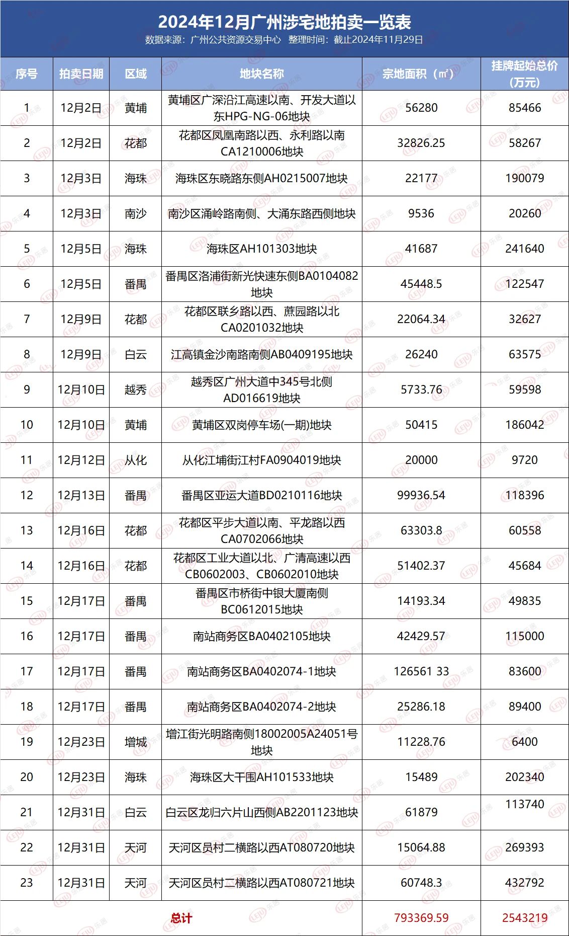 12月广州预计将有23宗宅地拍卖,总起拍价约254.3亿。