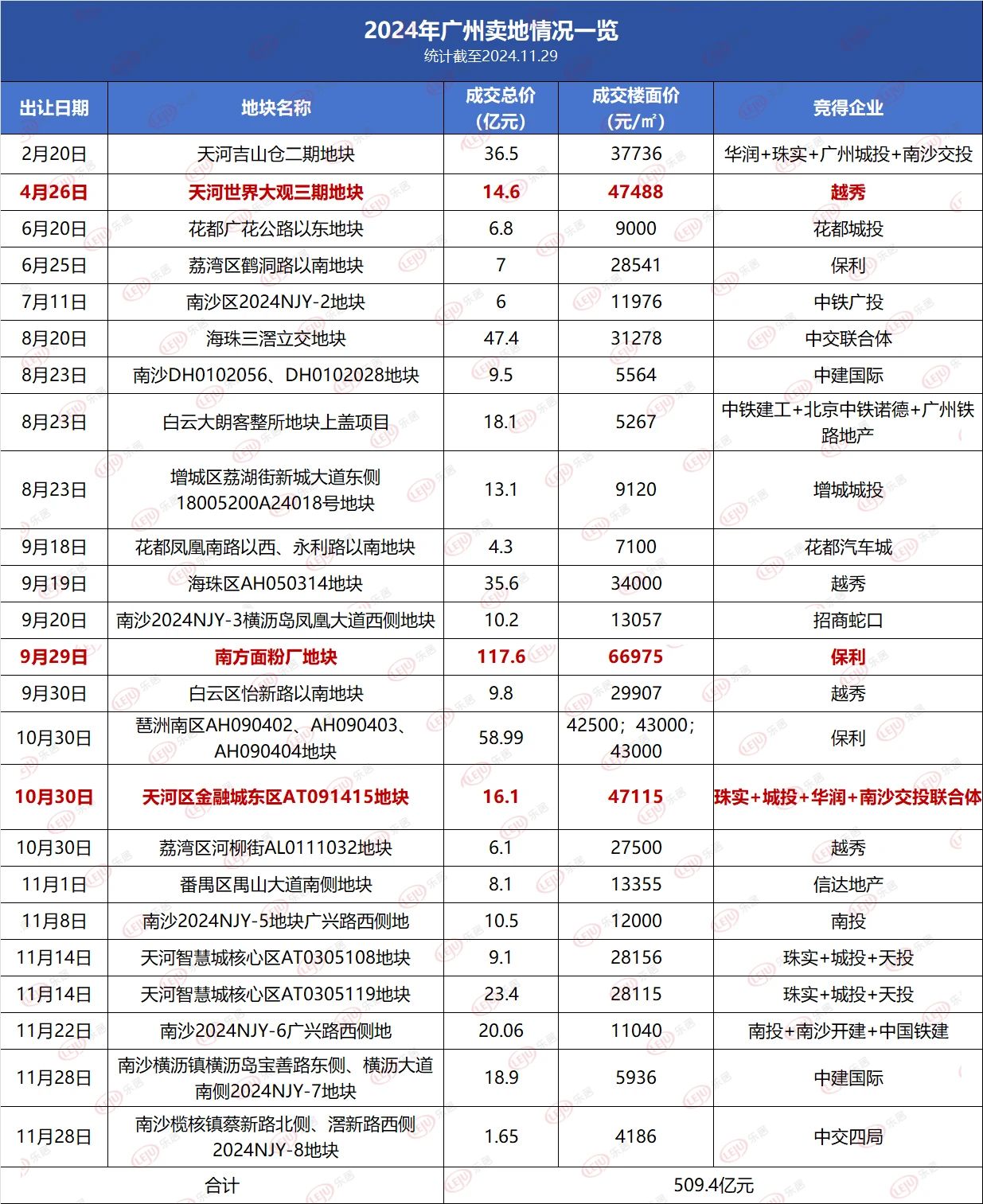 截止今日(11月29日),今年广州只卖出24宗涉宅地,收金约509.4亿元。