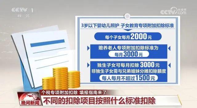 个人所得税专项附加扣除的各个项目,都是按照什么标准来进行扣除呢?3岁以下婴幼儿照护、子女教育专项附加扣除标准为每个子女每月2000元。赡养老人专项附加扣除标准为每月3000元。独生子女可每月扣除3000元;非独生子女需与兄弟姐妹分摊扣除额度,每人每月不超过1500元。