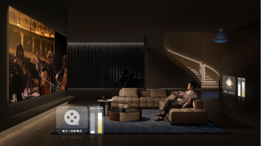 此外,华为鸿蒙智家利用AI技术,智能识别并解决场景冲突问题。在观影、阅读等需要专注的场景中,它会自动关闭其他房间的灯光和声音,营造一个最佳的私密空间。