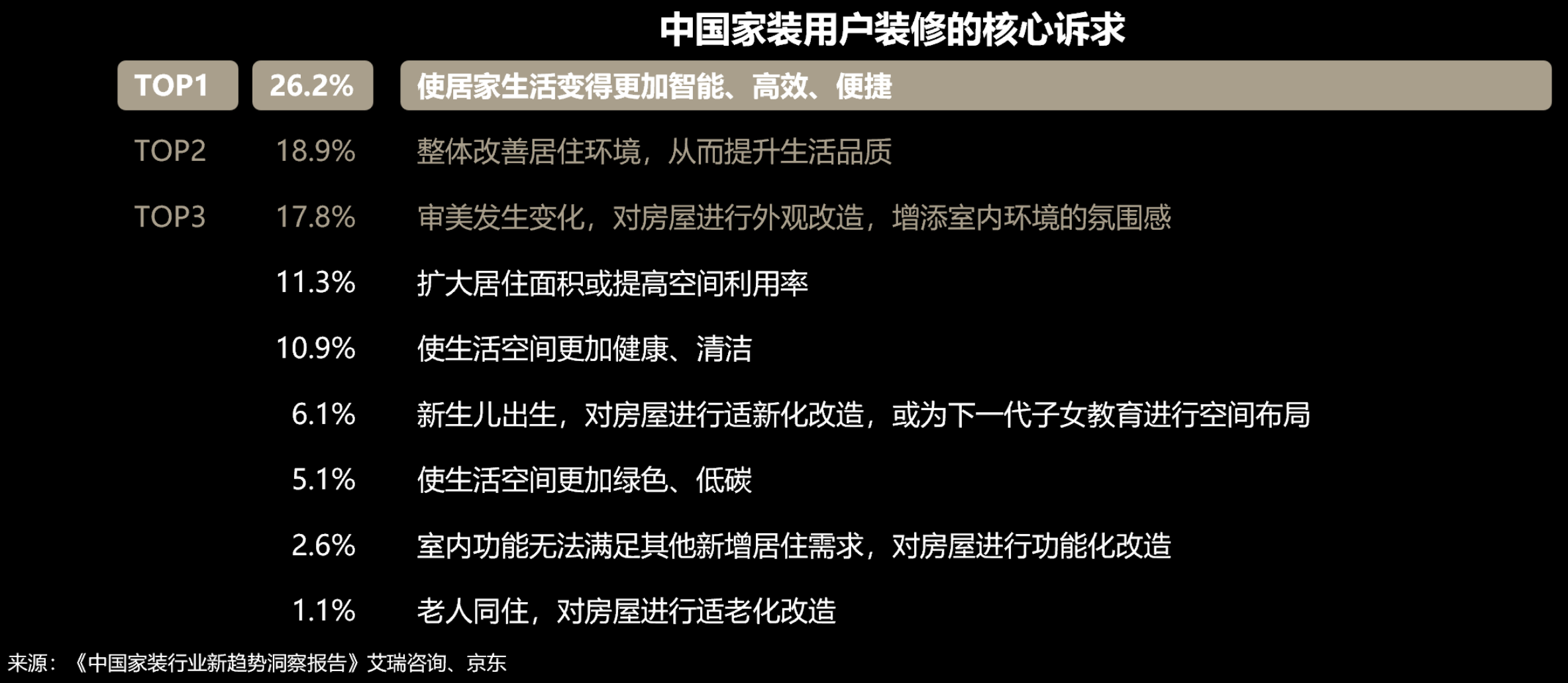 相关调研也显示,我国家装用户装修的核心诉求排在前三位的分别是实用性、品质化和美观性。