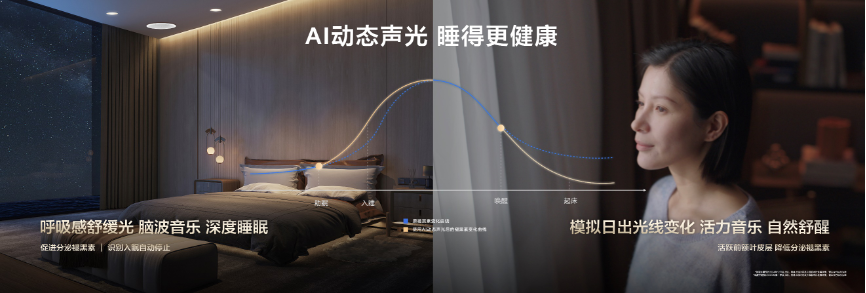 声光影多感官氛围体验也是智慧家庭的重要组成部分。例如,全场景自动控灯技术,无论是阅读时的柔和光线,还是观影时的暗光环境,灯光都能自动调整到最适合的亮度与色温,特别是针对老年人及幼儿眼睛不同状态,打造适老适幼光,营造出温馨、舒适的家居氛围。