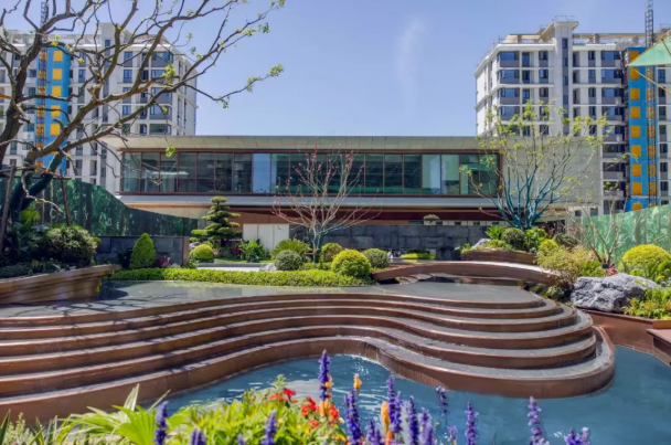 而且在设计上,巧妙地将庭院景观引入到架空层,实现空间即自然的艺术视觉感。