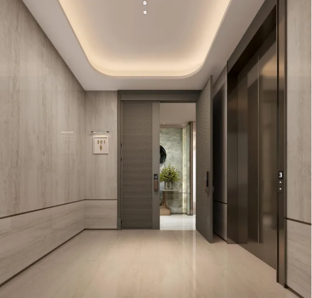 以洋房190平户型为例,入户大门配备锤纹龟背铸铝装甲对开门(143平户型采用同款大门),单个造价就要4万+,彰显出不凡气势。门锁为隐藏式多合一智能锁,支持人脸、指纹、密码、蓝牙等多重智能归家模式。